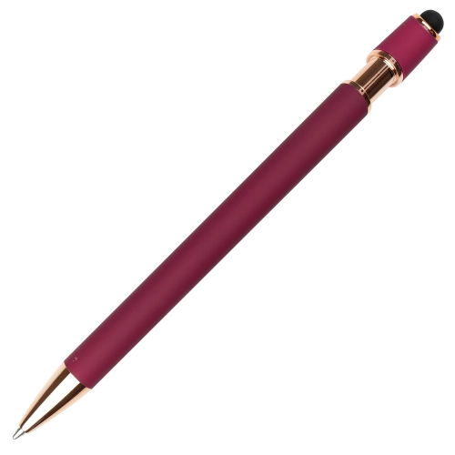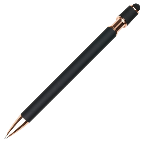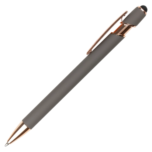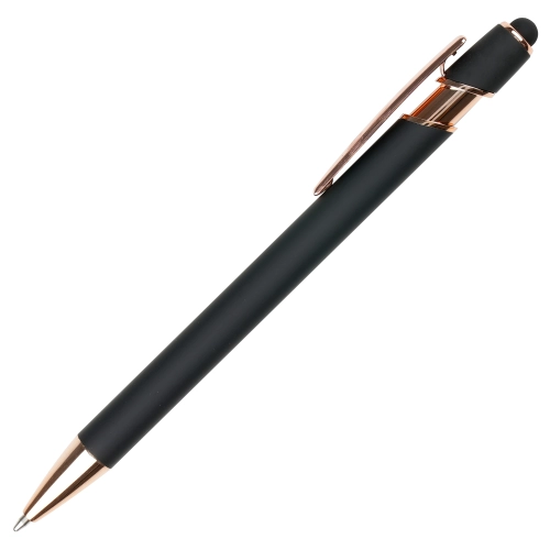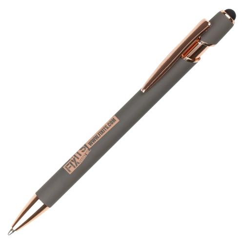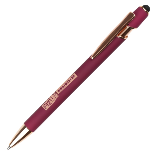 A sleek modern design in this soft feel ball pen with rose gold trim and stylus. Undercoated for a rose gold engrave finish.