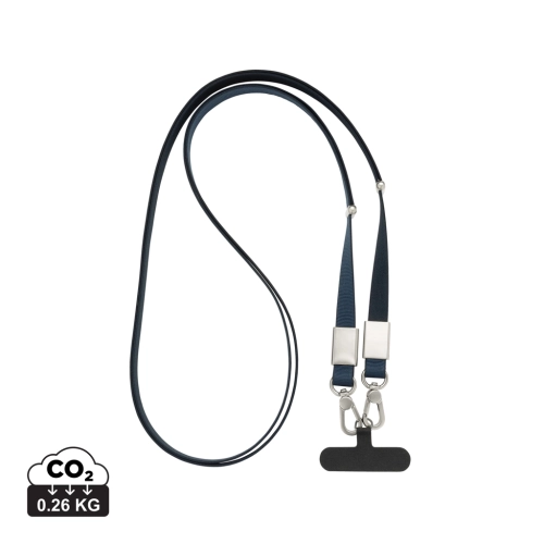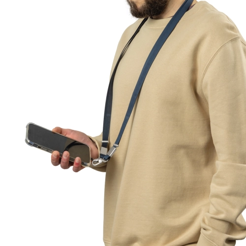 Nivo is a universal cross body phone lanyard designed to keep your device secure and always within reach. Made from recycled PET with premium-grade aluminium details, Nivo combines durability with a clean, modern look. The thick, high-quality strap is designed for maximum wearing comfort, making it ideal for daily use. Its universal and strong design works with any phone that uses a protective case, allowing you to carry your device safely without limiting functionality. Nivo can be worn comfortably around the neck or as a cross body strap, giving you complete hands-free convenience wherever you go. The adjustable strap can be easily set from 200 cm to 120 cm, ensuring a perfect fit for every user and wearing style. Made with RCS (Recycled Claim Standard) certified recycled PET and recycled aluminium. The total recycled content is 18% based on the total item weight. PVC free and packed in plastic-free FSC packaging.