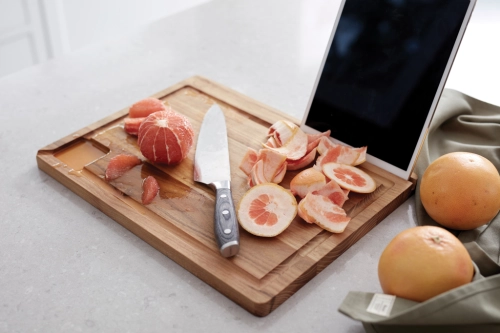Cutting/serving board large enough for both cutting, preparing and serving. The board is provided with a handy holder for tablet or mobile phone, so you can easily use it while following your favourite recipes online. There is also a deep juice groove that runs along the whole board with a pouring spout avoiding unnecessary spillage. Made of FSC®-certified teak.
