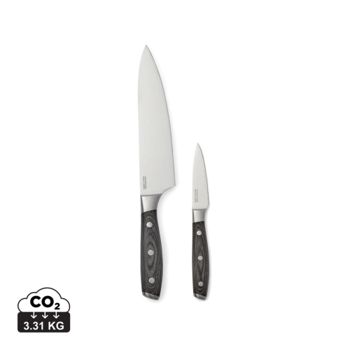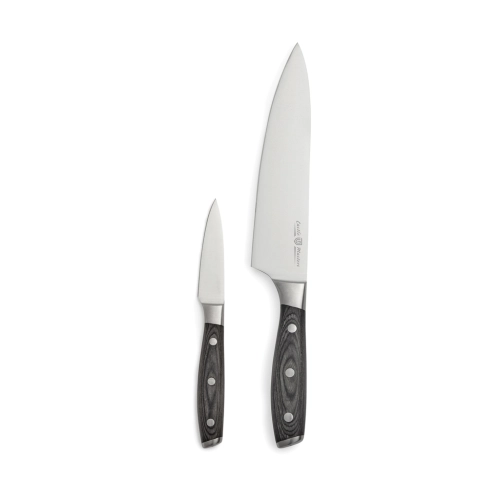 Set of one chef’s knife and one paring knife. The knives are made of X50CrMoV15 German steel with a Pakkawood handle. The easy-grip handle and superb balance in the blade makes the knife comfortable and easy to work with. Chef's knife: 20 cm blade. Paring knife: 8 cm blade.
